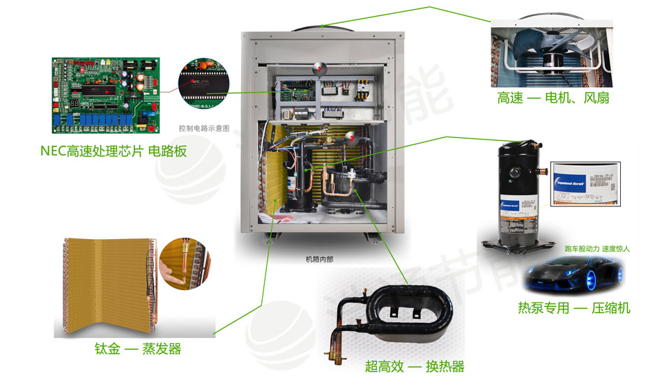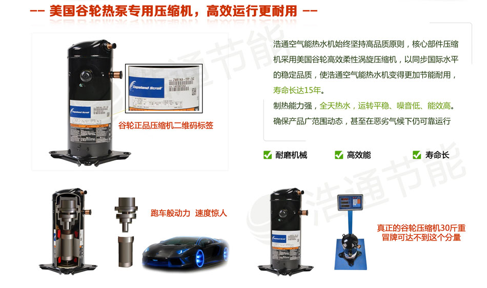 ● 热泵主机采用世界名牌顶级产品——柔性涡旋压缩机。